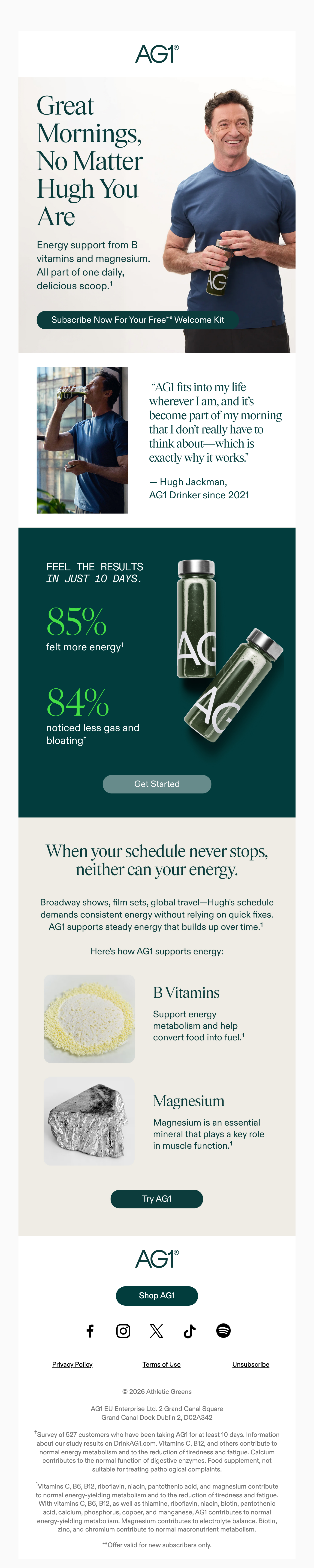 Browse AG1's complete welcome email sequence — every email, subject line, timing, and design deconstructed. See exactly how their 4-email flow converts new subscribers.