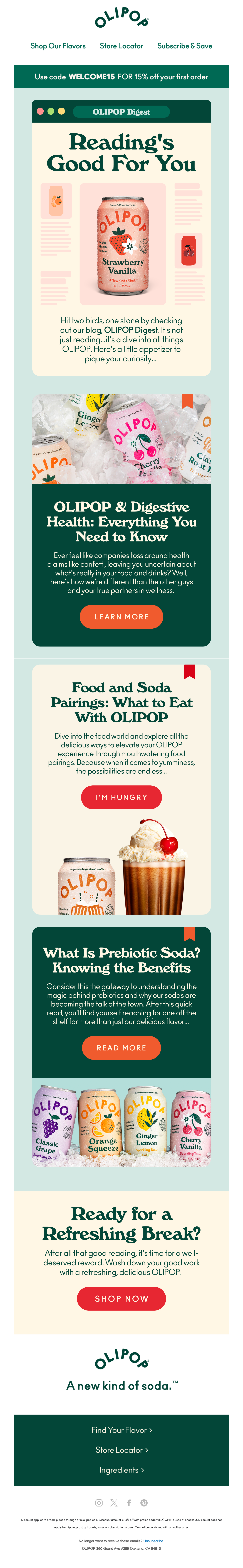Browse OLIPOP's complete welcome email sequence — every email, subject line, timing, and design deconstructed. See exactly how their 9-email flow converts new subscribers.